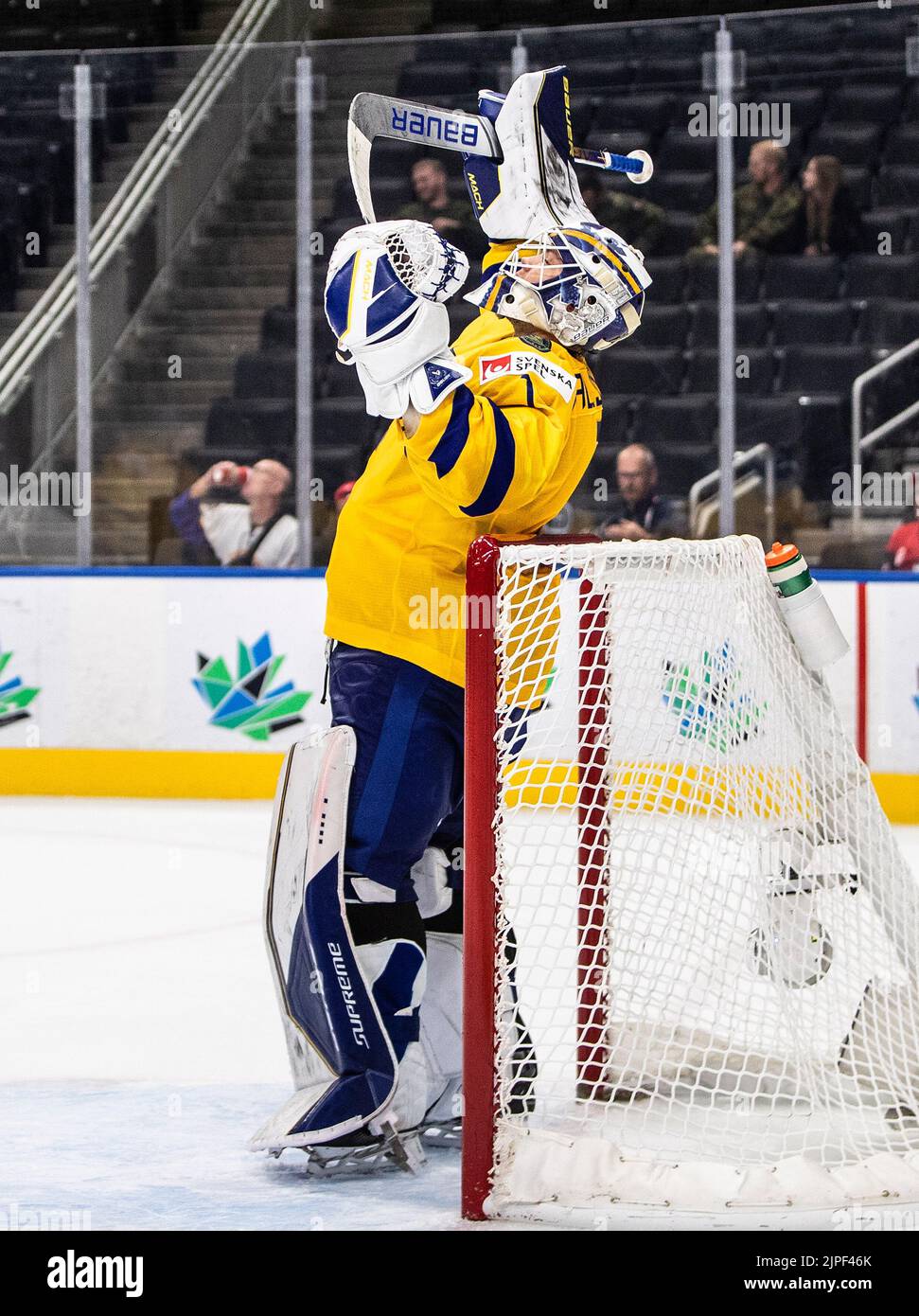 August 17 2022 Edmonton Ab Canada Sweden Goalie Jesper Wallstedt 1 Celebrates The Win Over Latvia During Iihf World Junior Hockey Championship Quarterfinal Action In Edmonton On Wednesday August 17 2022 Credit